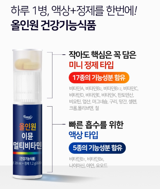 건강 관리의 핵심은 꾸준함입니다. 퍼니트 올인원 이뮨 멀티비타민은 바쁜 현대인들에게 최적화된 제품으로, 여러 영양제를 동시에 챙길 수 있는 효율적인 선택이 될 수 있습니다. 면역력 관리가 중요한 요즘, 나와 가족의 건강을 위해 올인원 솔루션을 고려해 보시는 건 어떨까요?